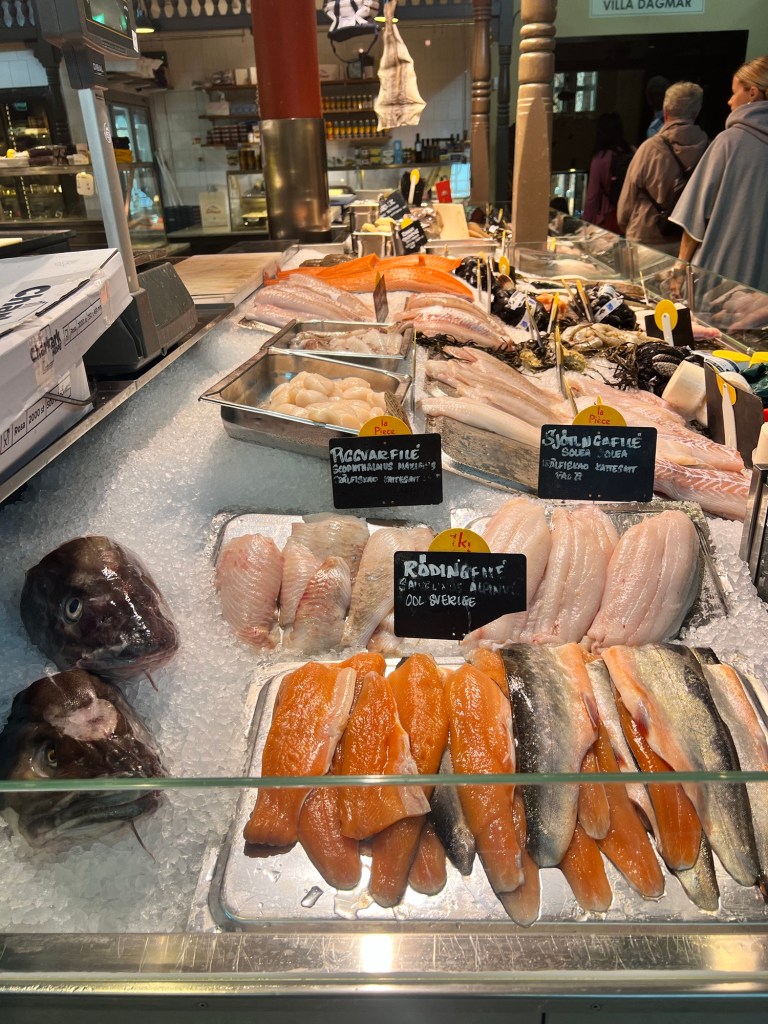 Östermalms Saluhall or food court: Filets of salmon and herring showcase the ice filled displays, highlighted on Anthony Bourdain’s show