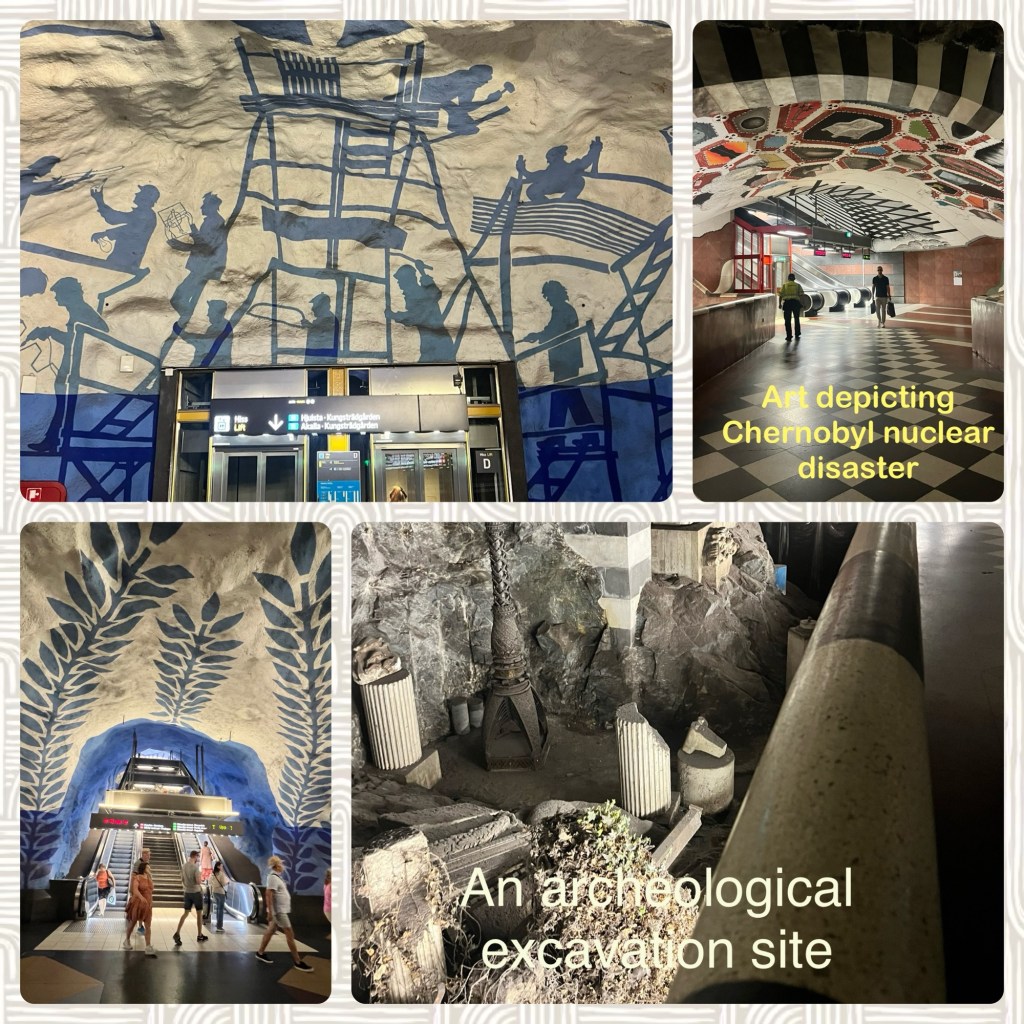 Stockholm Subway art: Art depicting 1) an archeological excavation site, 2) silhouette of workers, 3) Chernobyl nuclear accident in Russia.